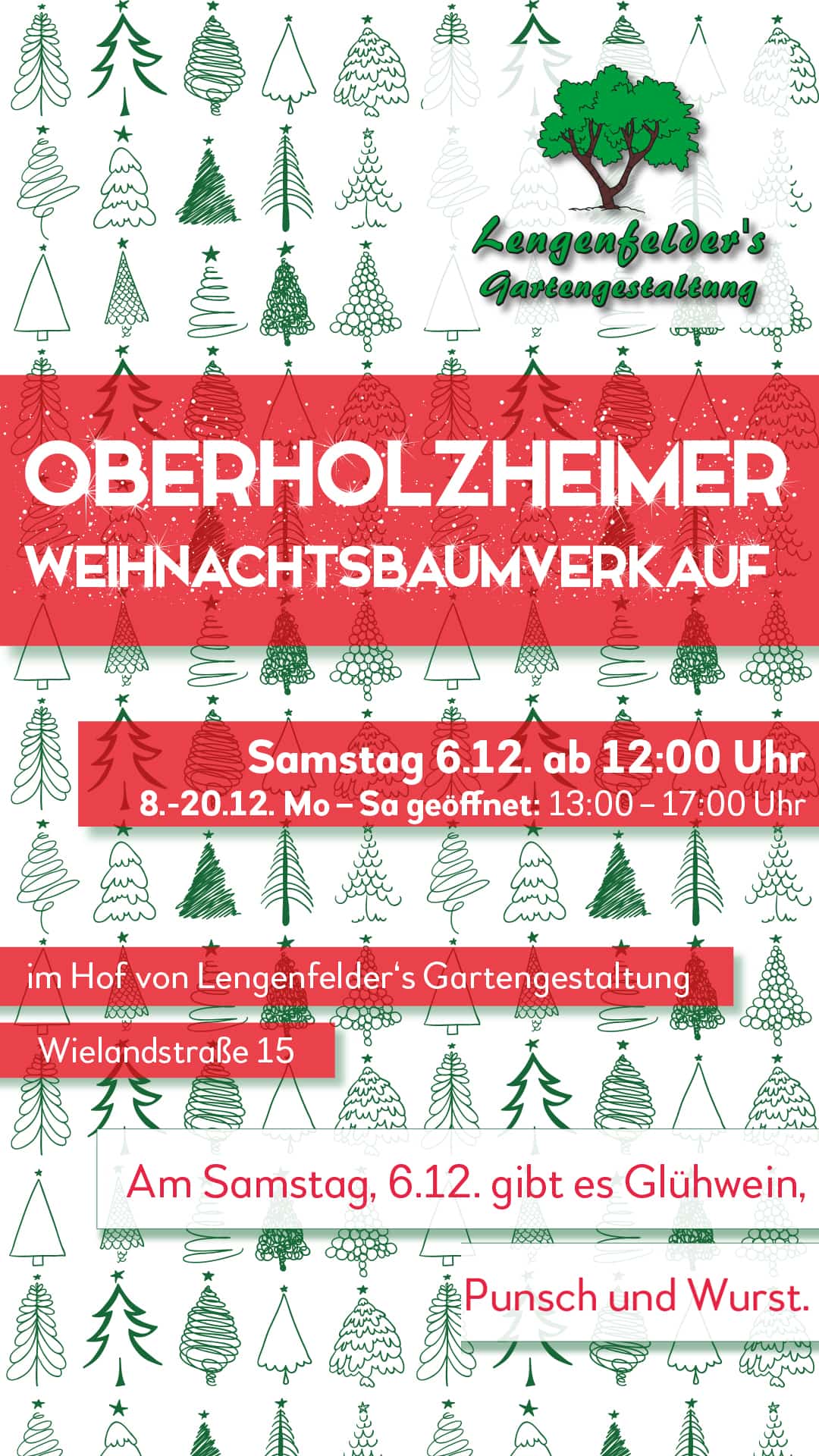 Täglich ab dem Samstag vor dem 2. Advent findet unser Oberholzheimer Weihnachtsbauverkauf in unserem Hof in der Wielandstraße 15 in Oberholzheim statt.